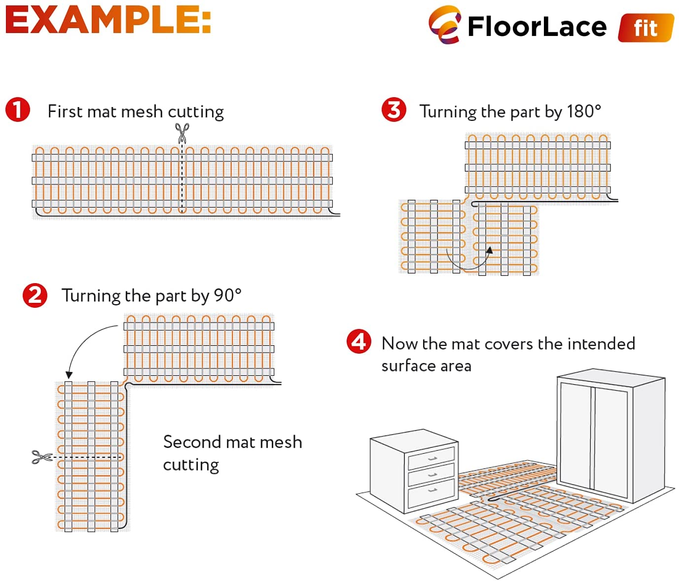 • FloorLace FIT is a heating cable attached to a fiberglass mesh (the mat); Entire mesh has adhesive backing, so it adheres to the floor and stays put during installation; EASY INSTALLATION for square or rectangle areas; Mats are 20-inches wide (and length varies by size selected – see product description); The mesh of the mat can be cut to better fit desired area, the cable cannot be cut or altered in any way; Kit includes: heating mat, and installation manual. 30 YEAR WARRANTY